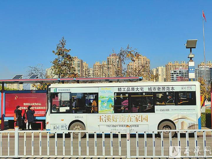 12月15日,玉溪中心城区一辆公交车车身上的房地产广告。
