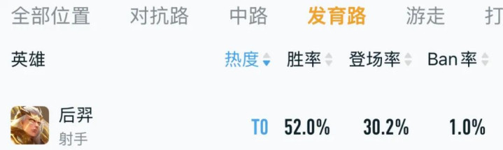 后羿再次成为T0胜率高达52%,登场率有30.2%